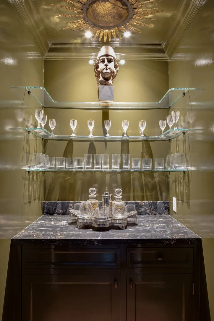 Dry bar with Nero Portoro marble counter, lacquered walls, floating custom glass shelving, and U-Line wine/beverage refrigerator